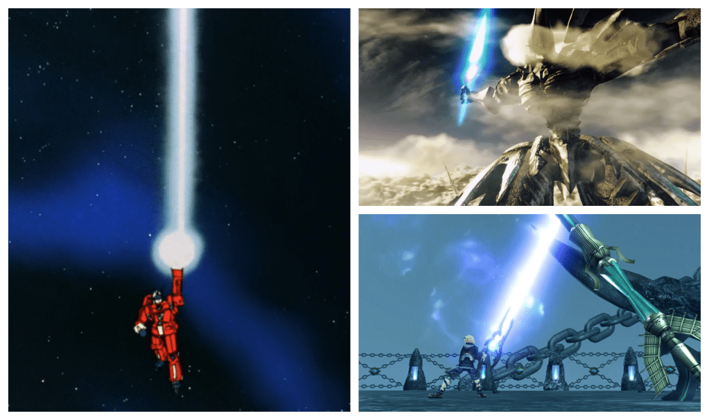 The fearsome, all-powerful ancient mechanical weapon’s appearance…does not actually match up to its military legacy, looking like a mere toy instead. The Monado a big dumb lightsaber with a goofy looking handle, and the Giant God Ideon a sacred combination of three different construction trucks that may or may not be unapologetically designed to sell merch to children. Both brightly coloured, and running off a circular energy gauge. Its power is immense, being able to directly grapple with the fabric of reality, and giving the users perception beyond their wildest dreams. The Monado provides Shulk the ability to look through time, while hooking the Ideon’s power source into their space radar lets that crew map out the entire universe. Though for as overwhelming as they are, the power of each seems to ebb and flow at its own whims, never truly submitting to those who wield them. It often feels like the weapon is using its pilot, not the other way around.