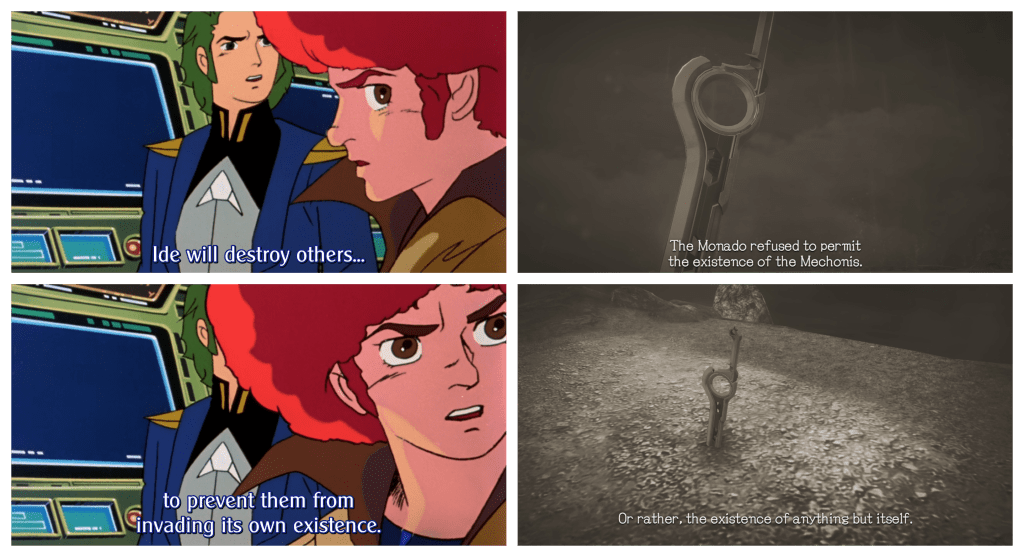 Whether it be the Ide or Zanza, the weapon has long housed its own selfish consciousness, and frequently channels its will into their preferred host to direct them toward a future of its own design. Its solipsistic wish is nothing less than the complete elimination of everything but itself, consuming all and letting its mind swell until it takes over, or effectively ‘becomes’ the universe itself. The weapon had never been protecting its people at all, but simply preserving them as cattle – herding them towards its ultimate goal of destroying and recreating life in its own image. Yet even still, even despite witnessing its malicious touch firsthand, the undeniable truth is that they just aren’t able to give up its power yet. They need it, and there doesn’t appear to be any way around that. So regardless of any revelations they may have now gained, of the horrific truths that have revealed themselves, they simply have no choice but to continue as its prisoner, struggling only as much as their shackles will permit. And while the Xenoblade crew do manage to wrestle free of its control, invoke the god-slaying sword and create a world where they can be free, the Ide ultimately ends up destroying its passengers: stripping them of their flesh, overwriting their ego, and assimilating them into its own personality complex. Like the Getter before it, and yes despite Getter Robo beginning in the 70s the Getter is an Ide clone considering prior to the series’ release it was again just a clone of Mazinger’s miraculous photon energy without any rampant consciousness connotations, Zanza and the Monado are functionally just Ide and the Ideon with a different name, and it follows that the story of Xenoblade is basically just an altered retelling of that which it originates from.
