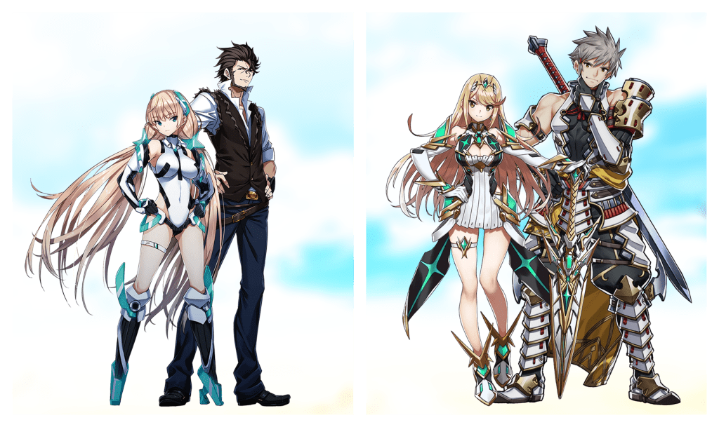 The most immediate link you’ll find between the two of them is of course that Angela’s design has obviously inspired Hikari, Pneuma and prototype Homura. Hikari is pretty self-explanatory: blonde, wearing a short white dress with black details on it, and having the glowing green highlights all over. The crosses that show up over her outfit parallel Angela’s X-shaped hairbands, and she also features the gem on both her chest and garter. Pneuma more specifically shares the hollow green loops that appear on Angela’s design, as well as the black tips on her white forearm guards, and rectangular high-heels. And the prototype design has both the same headgear and the giant twintails. These are the things that first beat you over the head and make you go “hey, wait just a second, that’s a xenoblade 2”, to the point of just barely avoiding plagiarism – if you even give it that much lenience. However it’d be more accurately acknowledged as self-plagiarism, since this design consistency actually stems from all four being designed by Masatsugu Saito, one of the many artists brought onto the project to help realise its smorgasbord of styles.