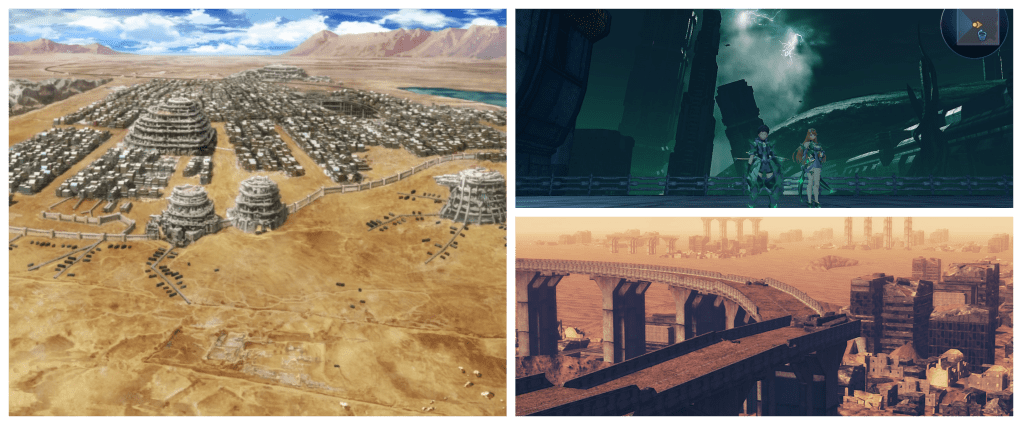 So anyway the sassy blonde avatar makes her way down from heaven, and when the pod lands on the planet, she takes her first, nervous steps into the wide world of the old frontier, finding herself presented with a devastated surface barely clinging to life. This barren setting paves way for a hefty narrative focus on environmental and social decline as the titans steadily fall to ruin, and the post-apocalyptic cityscapes left in the wake of the Nano Hazard and Conduit Incident create important imagery shared between Expelled From Paradise’s desert planet, the decrepit corpse of Morytha, and the dusty remnants of what was once the flourishing colony of Elysium.