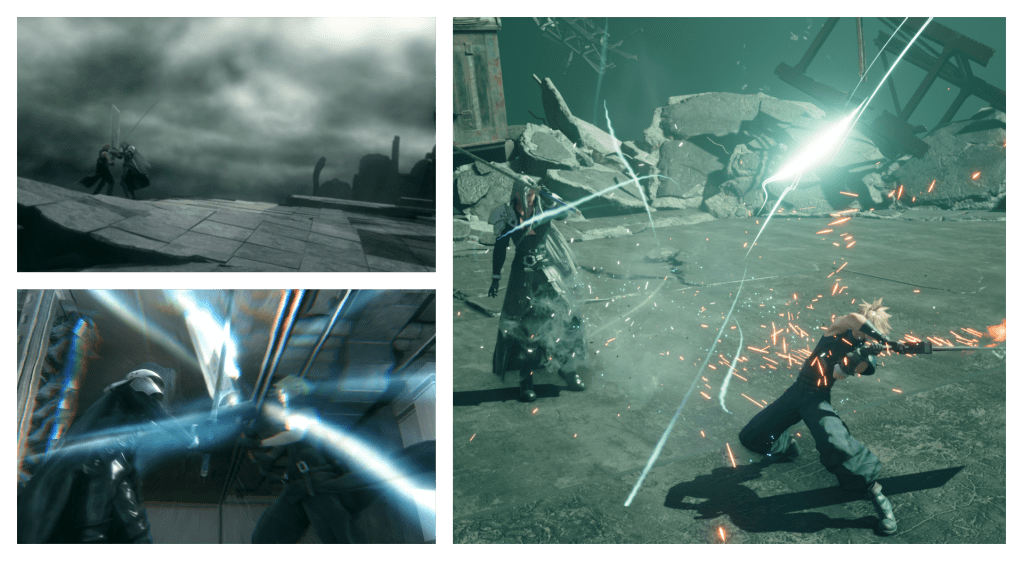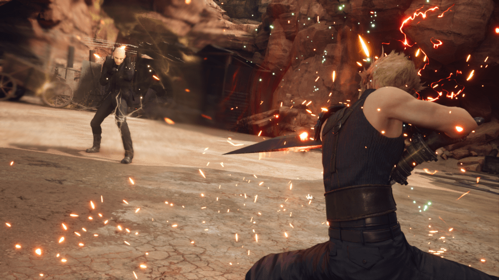 They mention the degradation, they mention Project G, and there are certain musical links such as the original trailer being set to Beyond the Wasteland or arrangements of The Promised Land and Elfe’s Theme. Rude maintains the theme briefly given to him in Advent Children when showcasing his firework bomb. Johnny reuses his established design from Episode Denzel, therein revealing that Dyne will likely look the same way he does in G Bike.