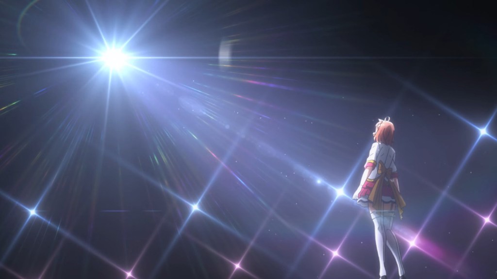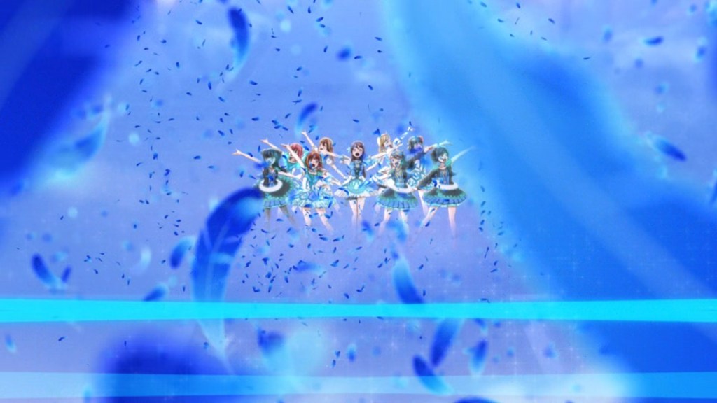 When they perform at the Love Live finals, they step into the realm above. An endless expanse of cloud sits at their feet and there’s nothing but space visible above them. Standing at the highest of heights, at the climax of a long-fought journey upward and at the most powerful they will surely ever be; for just a second, just one brief second, Aqours’ power temporarily disrupts the setting and they literally break reality.