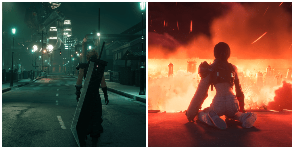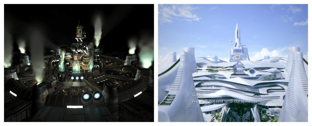 Final Fantasy VII is geared toward many of my own aesthetic biases. I referred to it as ‘retrofuturism’ in my Intergrade review, though that might not actually be the correct way to class it. What I’m referring to is the specific style of its urban sci-fi. The 90s science-fiction aesthetic was unique to that era. The technological ideal wasn’t yet standardized as a sleek, white vehicle like Remake’s Neo Midgar, so there are clunky supermachines and hi-tech CRTs. Man vs the machine where the environmentalist message is steeped in moral ambiguity, and every element of the weary world cloaked by melancholy. Sweet, sweet melancholy. I’m not sure why I love it so much, but I certainly do. They even chuck kaiju in there for good measure! It has this mix of everything I love. Of old-world mercenary heroes in a modern, industrial setting. I definitely spent my high school years fantasizing about what it would be like if it were possible in this world to make a living as a wandering hero. I was young, y’know. But Gaia is that world. It sits somewhere between the modern and the medieval. Still full of small villages and monsters roaming the vast wastelands, yet all of that encased within a steampunk interpretation of technology. The job of a SOLDIER first class is much like the vagrant hero roaming between town solving any and all problems, and the king still dominates the world through economic and political power. Midgar, encased within circular walls and divided into districts, is a kind of castle town. Except that this time, the king’s castle is an industrial skyscraper.