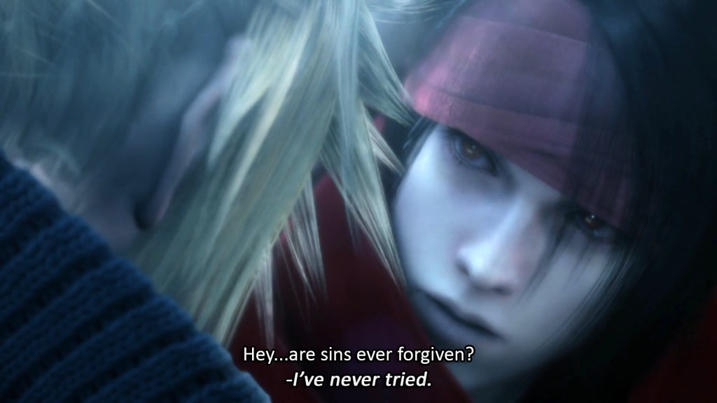 Sephiroth expressed his love for the world and was betrayed. He is the embodiment of a divine evil, born as the crystallisation of human greed. Man was no different from monster when they manufactured him to be a weapon. Sephiroth didn’t want to become the great destroyer, but Shinra’s machinations set him down a whorl of hatred in which no voice could reach him. Thinking about it that way, his fixation on Cloud becomes a lot more tragic. Sephiroth is a very intelligent man so you have to imagine that he’s probably realised long ago that Jenova does not truly qualify as a mother, nor was she a Cetra. He still talks about her as such in Advent Children, yet we also know that after a certain point in FFVII he stops being subservient to it. And Hojo is the biggest monster in all of the storyline, so Sephiroth wouldn’t dare accept him as a father. Yet he clung to Jenova because that rotting extraterrestrial corpse became the only thing he had resembling family. Maybe he felt jealousy toward Aerith for being the daughter of his beloved Dr Gast. Maybe he’s so driven to erase everything because somewhere in his subconscious his self-loathing and immense pride are amplifying each other to construct a veil over his own feelings of loneliness. Cloud, for better or worse, is the only person left alive who was once something of a friend to him, and so it does not go unnoticed that Sephiroth considers him special. If we apply this lens then when Sephiroth informs Cloud he wants to sail the cosmos like his mother that statement may be laced with self-mockery, and it better explains why his critical piece of dialogue is “I will never be a memory”. It is to carve himself upon the one person he still can. Cloud really only engaged with Sephiroth as a hero-turned-villain, so his recollection of the Nibelheim Incident – or whatever is left of it – lacks mention of Sephiroth’s plea to resist the call of the invader. But when this same scene is approached from the viewpoint of Zack, the scenes do highlight the turmoil Sephiroth was in while he tried to find any excuse to silence what Genesis had told him. Ordinarily characters like this are built to have a redemption at the end of their struggles. It’s the Darth Vader archetype. Sephiroth is tragic, but not entirely sympathetic. He dove off the deep end so very long ago. Aerith says “He’d tell you that he only cares about the planet. That he’d do everything in his power to protect it. But there’s no greater threat to the planet than him.”, which is a very adept summary of his narrative position. Sephiroth was not a monster of his own making. He was wronged by Shinra just as Cloud and Barret were. Yet all the same, Sephiroth is the man who burnt down that village, and tried to extend that death out to the whole world. Irrespective of where he came from, despite what overwhelming isolation may still be driving him, it’s too late. That one-winged angel is the world’s enemy. One of the things that’s interesting about him is that delicate melancholy, that string of morality pulled so tight it snaps. They could lament the path that lead him to where he is, but Sephiroth goes well past the point of forgiveness. The world had its chance, yet the hero was systematically betrayed by his friends, his people and his society until madness was the only path left for him. A grave sin was committed and now mankind has to bear the full brunt of its consequences, no matter how battered they are by the end. Sephiroth carries such gravitas. However at the same time…if we could see Sephiroth smile again at the end of whatever he’s doing in Remake – if Cloud, Zack and Aerith could fix him – then maybe that wouldn’t be such a bad feeling. None of these ideas are new to Advent Children, but that line Marlene delivers carries such implication despite being so short. I swear every shot and every piece of dialogue in this film is iconic. Utterly captivating. It isn’t often that I think a 2 hour film easy to sit through, but Advent Children is so well-directed that it’s hard to walk away from the screen.