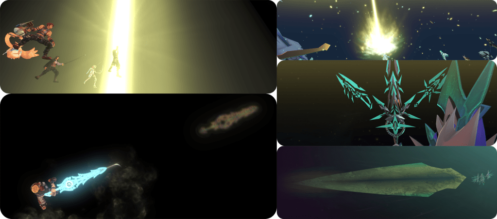 The biggest obstacle in classing Pneuma as one is the lack of any real Monado arts, where even Meyneth’s sword gains access to Monado Fear and a generic Buster skill in the hands of Zanza. However maybe the Arts aren’t even important since Shulk can use them with a replica, and when Rex wields the Monado I via DLC he still channels his own golden ether through it with an attack that looks identical to something he had done with Pneuma prior. Additionally neither Meyneth nor Zanza ever display any symbols on their blades either. It is true that within the game’s internal coding the only Monado weapon is Shulk’s, as the Tertiary Sword retains the Aegis Sword class and enemy weapons aren’t categorized so Malos’ isn’t detailed either way (in the game’s bdat tables that is, Alrest Record explicitly calls it the Monado on its concept page). But that is evidently just because Shulk’s sword is the only one you can actually view in a menu. Considering Pneuma’s abilities are explicitly described as ‘using the Conduit’s power to rewrite the physical laws of the surroundings and manifest what she imagines’, the lack of Arts becomes an increasingly small issue. Because that description is precisely what the whole story of Monado in Xenoblade 1 had centred on. Broadly speaking their abilities are the same. Looking over some scenes in freecam, I also noticed another quirk which I believe links the specific technique Infinity Blade back to the Monado III. Namely that a flat image is projected ahead of the sword when Shulk uses its god-slaying Buster. It can be spotted for a brief second when Zanza is sliced through, but that’s so quick freecam is the only viable way to glance over it. Such a projection attached to the third Monado makes me think about how images of Pyra and Mythra are presented alongside the physical Pneuma during Infinity Blade. They both display that trait. Additionally Rex’s final strike is something of an unannounced Monado Buster, which can be seen in a more familiar form after the green ether dissipates. With a golden blade and an ether cloud following it, the buster left behind looks somewhat similar to the last attack of the Monado III. The projected image even has the same mysterious texturing found on the Infinity Blade afterimage. Although the player ordinarily can’t make it out, I wonder if this is something Monolith did for themselves to link the timing of the two finales. Perhaps it’s a sign that the pillars of light for both Shulk and Rex’s final attack occur simultaneously, since their moves have these linking visual properties in place. Again illustrating the only obstacle in this discussion is that the term Monado never comes up, since her powers so obviously function in the same way.