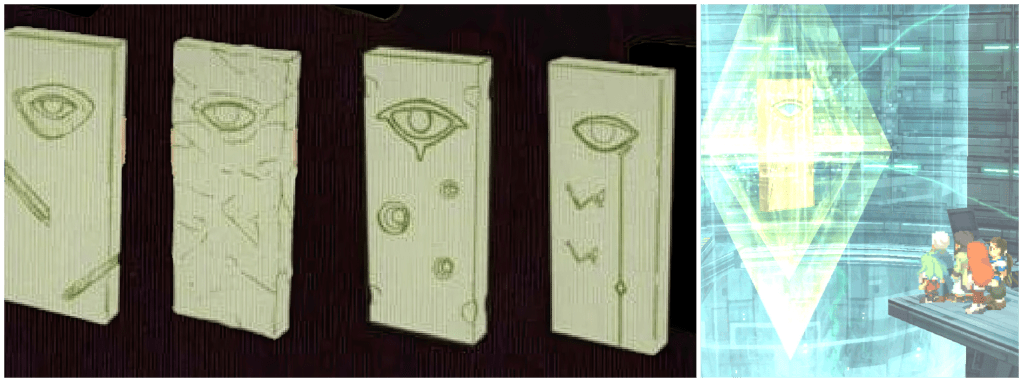 What’s not so obvious though, is what on Earth an Animus actually is. Looking at the illustrations, the main body of the Kadomony machine is the section known as the Persona molecular assembly system, and the rectangular vessels of Anima likely slot into the boxes on the left and right. I personally feel things fall into place best if we imagine that there were Animus Relics as well. There are never Animus tablets seen ingame, but structurally (as in for the concepts and for the physical machine) it just makes sense for them to have been the same as the Anima Relics which is why I allege their existence. Xenogears and Perfect Works are both frustratingly ambiguous about the Animus. It keeps repeating this idea that the Anima are the relics and the Animus are the original men, since that’s what they exist as during the events of the game and it’s therefore at the forefront of their explanations. The text will go out of its way to telegraph that the Anima are the biological compartments of Kadomony and provide a reference drawing, but then abruptly launch into exposition on the Animus without any similar clarification or context. Sometimes they refer to Animus and Anima as ‘the biological circuitry of Deus’ or connected to ‘the core of Zohar’, which can make it sound like they’re part of the grey titan’s body or golden monolith instead of the computer. But it’s more likely that they’re just indirectly acknowledging Kadomony’s central role in the Deus System, which is the name for the whole linked combination of interstellar bio-weapon Deus, quantum bio-computer Kadomony and infinite energy engine Zohar. Persona aka the Mother of Humanity aka Elhaym aka Miang has the Animus available to her when she crash-lands inside of Kadomony’s pod, because she then immediately uses it to create Cain and the Gazel Ministry to chase the missing Anima, so they need to have been part of the computer not the titan. Yet even still, some text boxes and flowcharts will do their best to mislead you into thinking that Anima Relics were the singular organic group in the computer, and that the Animus only came into existence after Persona crash-landed. But that’s simply not true, you look at the box a bit closer and it’s actually talking about -Animus-, Original Animus and Animus (humanity) as three distinct concepts or instances. The Perfect Works on more pertinent pages blatantly and repeatedly references both bio-elements as internal components of Kadomony, and only paragraphs later to some of the confusions ingame its text suddenly becomes very clear that both were part of Kadomony’s organic circuitry, that they’re male and female, and that the original Animus have specific Anima Relics that they’re counterparts to. Hence why I say that, considering they’re all part of the same machine, the twelve available compartments likely housed a paired set of Anima and Animus cores.