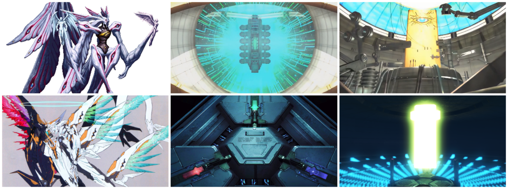 Whereas in Xenoblade the processor is arranged in a much more simple layout. It’s a self-contained processing unit with only three cores as opposed to the 24 of Kadomony, and although we are told that it has bio-computer elements we’ve yet to get any more specific details beyond that, only inferring roles based on its parallels to Kadomony that are taken a little further in each successive entry. The Conduit is separate from the processor, unlike Kadomony being built into the Zohar, and there’s no Deus System equivalent on Rhadamanthus. No clean analogue, at least. Since although Artifice Aion is a Conduit-linked weapon autonomously developed by the Trinity Processor, that somewhat resembles final form Deus with the colouration and wings, plus also being a cyclops mech modelled on Omega which was Xenosaga’s narrative equivalent to Deus, it just isn’t as plot-centric, autonomous or divine as the Deus System was.