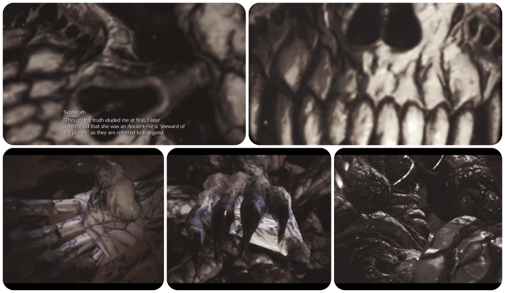 The form that Sephiroth finds her in at Nibelheim is therefore likely not Minerva, a random Cetra or Shiva. Despite all previous appearances having blue skin & pink eyes, the Rebirth model has grey skin & red eyes so that she doesn’t actually match Gi Nattak either. Rather, the most likely candidate from a narrative, thematic and visual standpoint is her having sensed Sephiroth’s approach and shapeshifted into the form which would affect his mind the most. Jenova peers into people’s hearts and appears in the form which will make them most vulnerable to manipulation. Which for Sephiroth, is Lucrecia. His mother that he’s been missing for decades. It being Lucrecia’s face is made especially apparent with the recent contexts from Ever Crisis which show Jenova’s spirit inhabiting the Masamune to appear as Lucrecia inside of his dreams a whole ten years before the Nibelheim Incident.