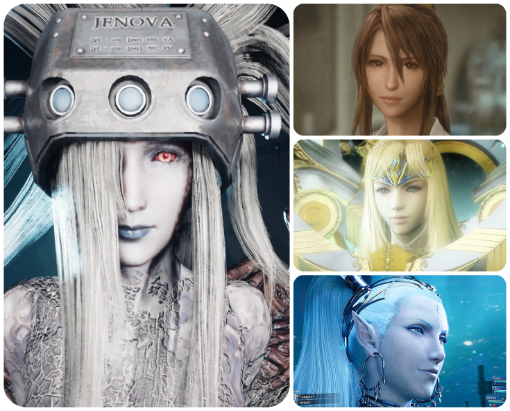 I’ve considered many options for this lady over the years. It could be a Cetran queen she imitated, or it could be a face she based on the legend of Minerva. There’s also a theory which pops up every now and then about FFX‘s Yunalesca possibly being related to Jenova in some capacity, and while the necessary timeline isn’t possible, I will say that Yunalesca is probably the closest match to Jenova’s face in the updated model from Rebirth.