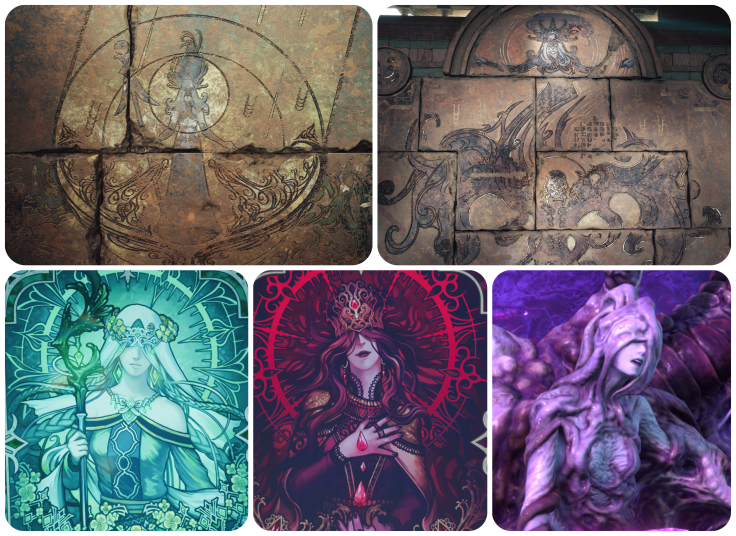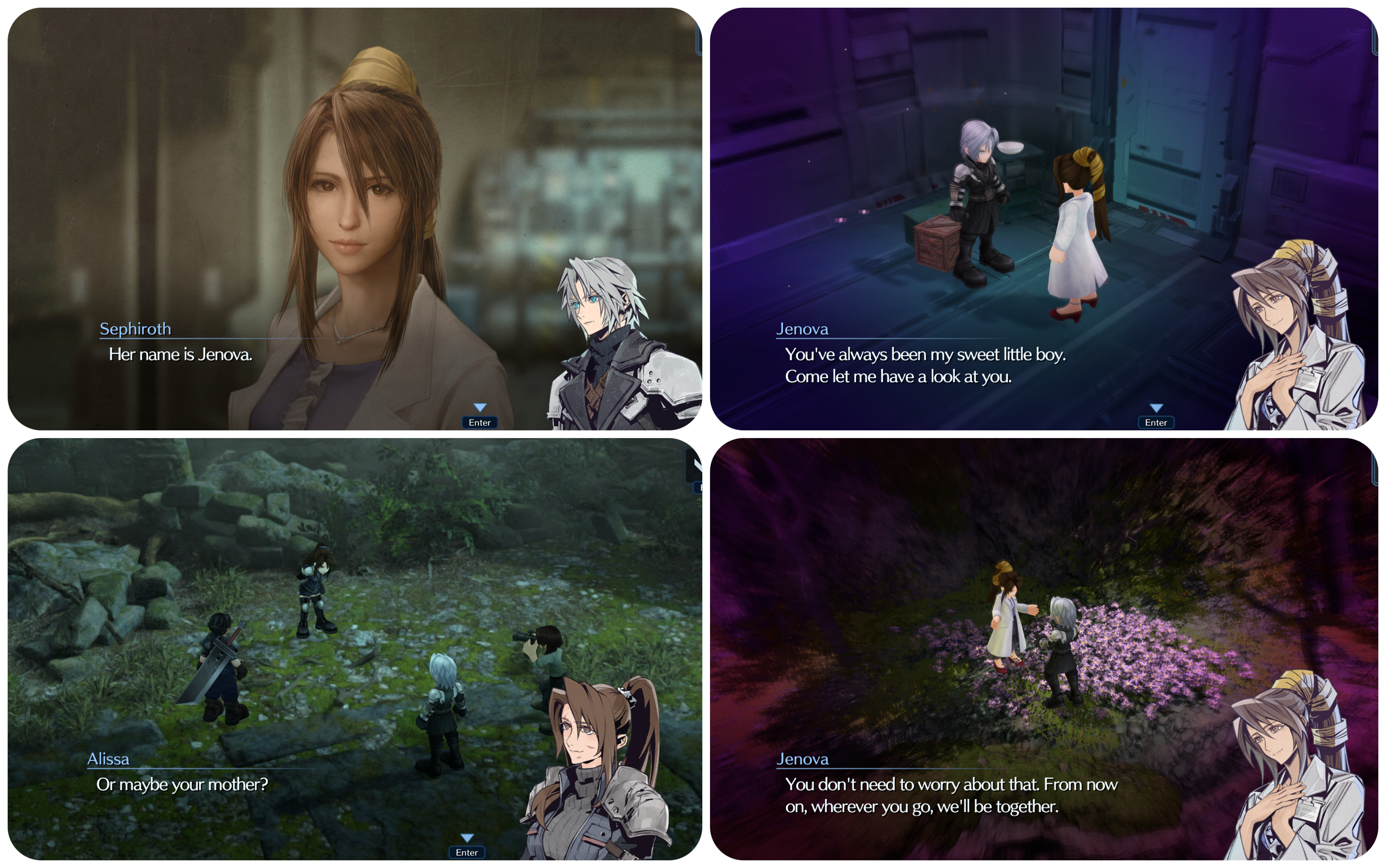 Revenant Mother Alissa from The First SOLDIER Episode 2 is a SOLDIER transformed into a Jenova creature through her spiritual residue now known to inhabit the Masamune. In that form, Jenova’s face is covered at the top again like the Shadowblood Queen. The Revenant Mother and Blighted Spirit are forms associated with a battle fought by Da Chao and the other Cetra of Wutai’s southern Igara region, totally distinct to the main conflict when Jenova invaded the Knowlespole Cetran community. The First SOLDIER didn’t recount Jenova having infiltrated Igara as a humanoid, it only really addresses her appearing in youkai forms, but the consistency in design between the Shadowblood Queen and Revenant Mother may suggest that this was her preferred Cetran form at the time, which is totally unlike how she looks when Sephiroth finds her or how she looked when Shinra excavated her out of the Northern Crater.