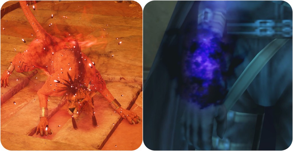 Cosmo Canyon’s Jabberwock is described as an ageless creature that’s survived for eons. Its skin is rocky like Gi Nattak, and the Gorgon Shield buff is achieved by empowering itself with red particles. The area we battle it in also has some cave drawings similar to that outside the Cave of the Gi. This may be suggesting that it became immortal after contact with the Gi’s Jenova cells.