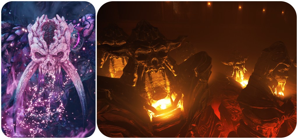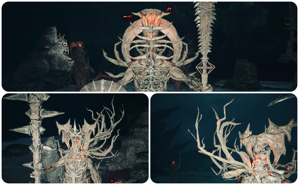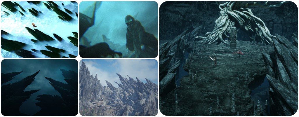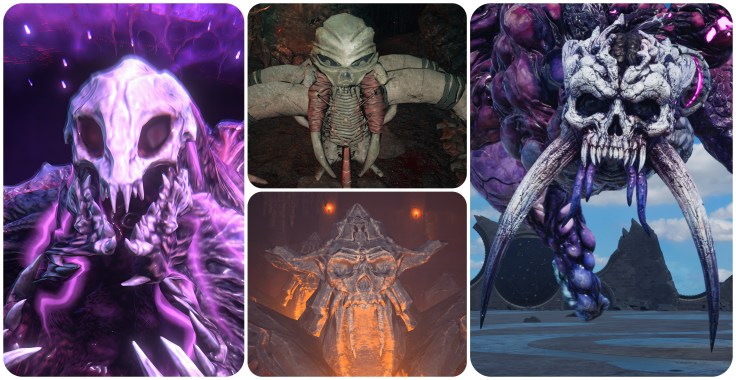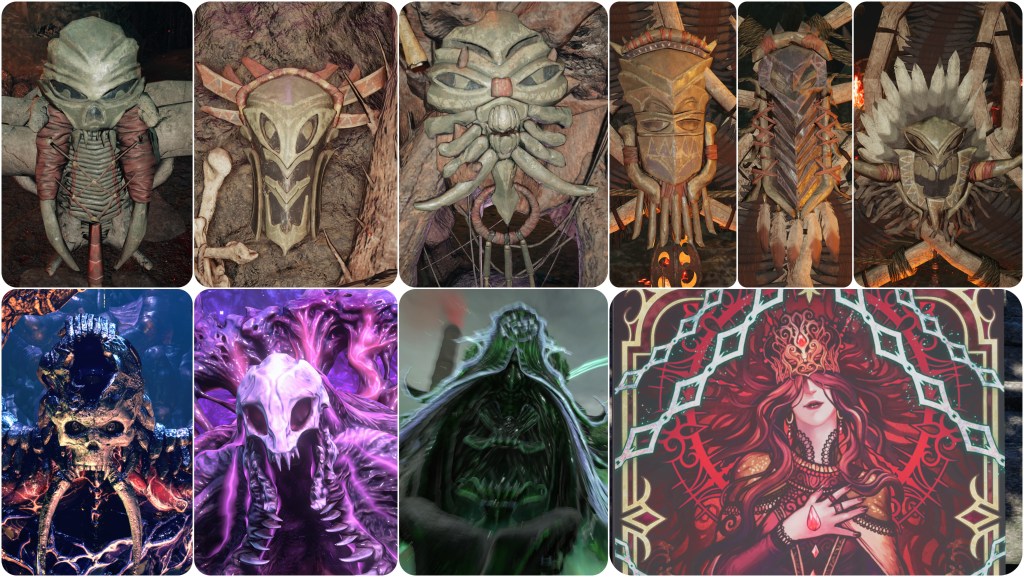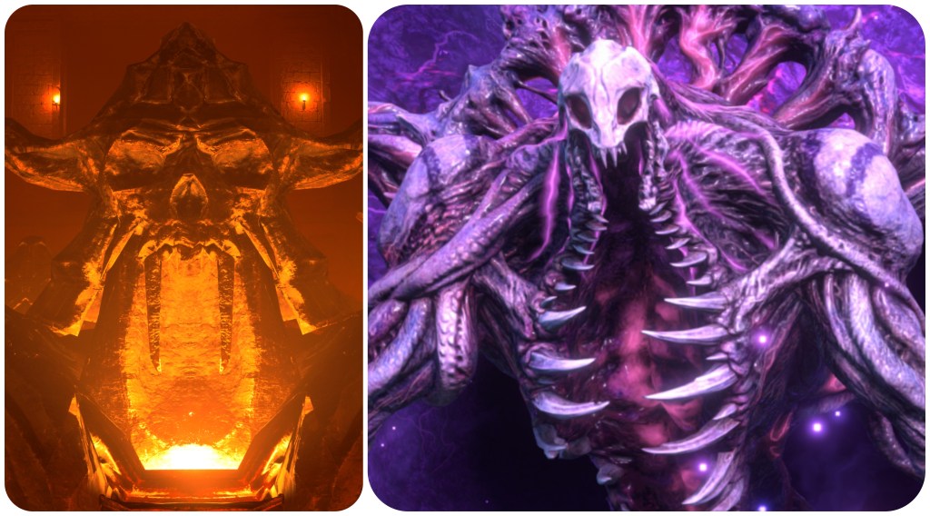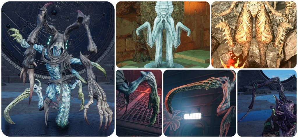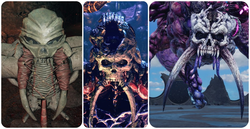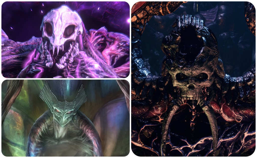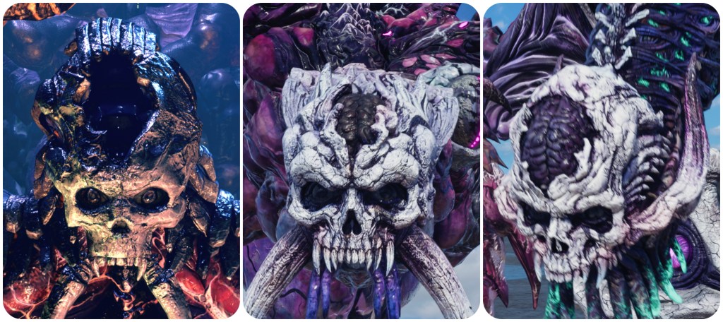 Further to this point, the Corridor of Effigies in the Temple of the Ancients is filled with statues of cloaked Cetra wizards and some demonic creature that heavily matches to the skull and tusks of Jenova Dreamweaver and the Gi masks. This is possibly a subtle reveal of information that Jenova had based her form on a demon from either Cetran or Gi folklore in order to most effectively terrorize them. Having so many of them intermingled with the shamans is likely symbolic of how Jenova’s imposters had begun to infiltrate the Cetra’s communities. The idea that this shape was lifted from folklore is somewhat supported by the Blighted Spirit, a form that Jenova took in the Asian-themed Igara region which had a totally different skull, and spawn that looked more like classical youkai instead of the sci-fi abominations we usually see.