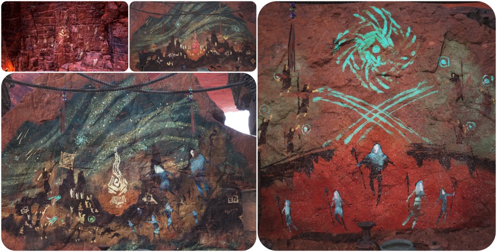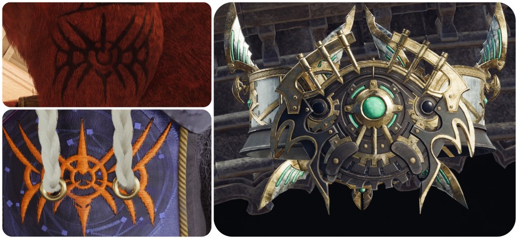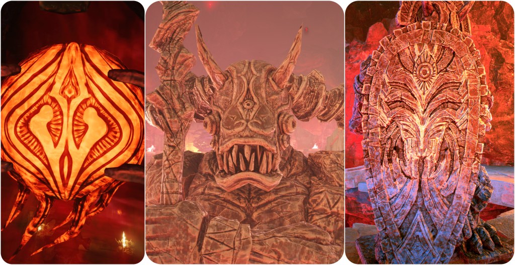 The most important and plainly just the coolest looking thing I noticed linking Jenova to the Gi is in the Ancient Temple. When I first played FFVII Rebirth on PS5, I mourned that it was impossible to clearly see the mural of Jenova that was hidden in the shadows at the other side of the divide. With the PC release I was finally able to take the camera over there using freecam tools. I decided to continue panning around and have a closer look through the murals in case they were hiding anything exciting, which is where I noticed that its Corridor of Apocalypse depicts a demonic face hanging above the Gi as they forge the Black Materia. This face with its six eyes and sharp teeth matches to the giant statue which we can find carved into the Village of the Gi’s cliffside Shrine to Oblivion. Angeal Penance’s shield also has the motif of a six-eyed face with a sharp-toothed smile.