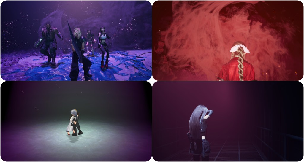 The intense lighting of the mako tank does tint her skin and you have to break past it in freecam to find out that she’s an ash grey. However, with both of these scenes once you know that her model is grey I think you can kind of see past the lighting and recognise that it’s grey skin under a blue or green light, and in no view is her eye ever pink. As far as I know this would also be the only instance of such a design decision happening in the FFVII Remake games. In my time replaying and obsessively screenshotting them, I’ve not once encountered a boss model where I felt that its palette had been altered to accommodate that kind of lighting colour interaction.