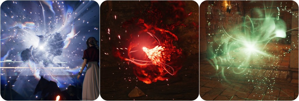 Pyreflies are the spirit energy wisps of Spira, and the Farplane is its afterlife space like the Lifestream. Just as it’s possible for Cloud and Tifa to be physically immersed in the Lifestream despite that technically constituting the afterlife, so too can Yuna physically step into the Farplane. When Spirans pass away their souls float as orbs. Sephiroth, Kadaj and Grimoire disperse in much the same manner when absorbed into the Lifestream. There are similar orbs too when Chaos, Nero and Weiss return to the planet. The FFVII Remake games do actually further this connection by showing us an Al-Bhed founder in the Shinra Museum, and having Aerith perform multiple Sendings. By putting her emotions into singing and dancing her No Promises to Keep ballad she’s able to appease the lingering spirits of Biggs, Wedge and Jessie, and she dances again when trying to quiet the Labyrinth of the Lifestream. The swirling of her staff in the latter particularly resembles Yuna’s routine, and during this we see Pyrefly-like orbs.
