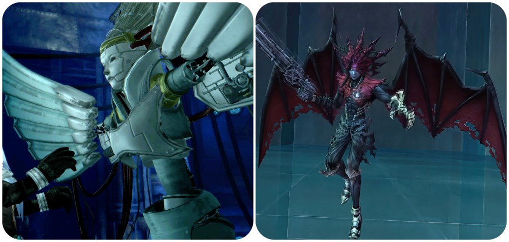 Angeal’s copies and transformations retain his white wing colour. Genesis’ transformation displays his black wing as well, but his copies begin to display bat-like wings as they grow ever feral.