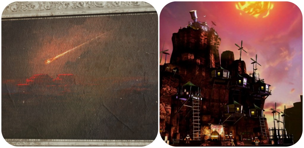 As I didn’t have a save in the Gi village, I had to quickly rush there from the beginning of chapter 10. Along the way, I noticed that Bugenhagen’s museum has a painting or photo of a meteor above Cosmo Canyon. This resembles Jenova’s meteor seen in the Stewards of the Planet presentation.