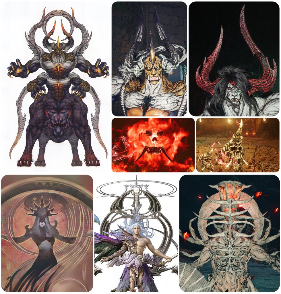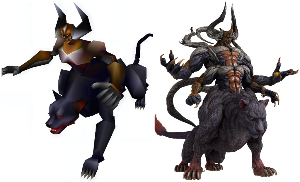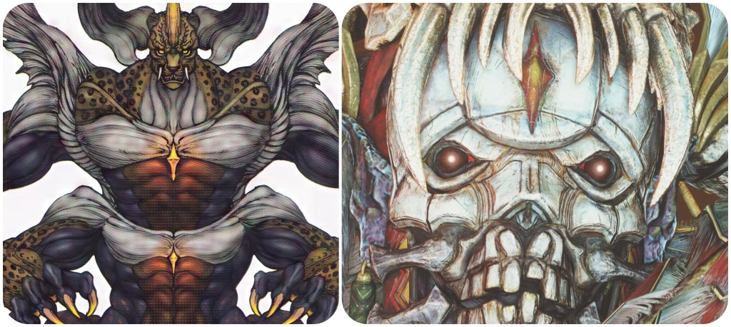 Even if we say that these fiends took up residence in the temple after the fact, that changes little in the reading. Because their mutations still undeniably resemble the Gi, yet FFVII speaking of a “strange illness” is surely meant to invoke Jenova’s so-called virus. The wording though gives the impression that the Cetra did not know this disease to stem from Jenova yet. Heck, maybe this small amount of Jenova infusion into the Chaos-like lifeforms and Gi Tribe are what called Jenova to this planet in the first place as part of her Reunion. The Panthera Protector’s outward fangs and central horn make it a dead ringer for the skull from Gi Nattak’s Soul Flame spectres and Doom spell. Together with the other things I just mentioned, this may serve well to galvanize a link between the Gi, Jenova and Chaos through parts of all three imagery sets manifesting in this one enemy and its mysterious ‘illness’.