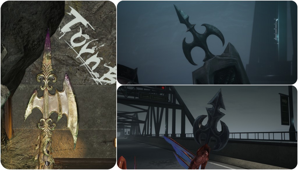 The first effigy in the Village of the Gi holds a weapon with spirals that resemble Jenova’s wings at Mt Nibel.