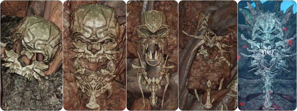 That signature skull gets passed down to other creatures experimented on with her genetic matter. Specimen H0512 has the skull exposed below its goopy face, Specimen H1024 seems to have the skull with proper skin on top of it. As suggested in my prior theory, this may have also influenced the creation of Chaos.