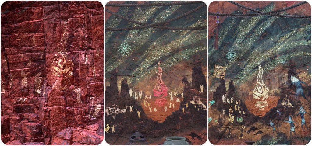 I feel like the murals are intended to be artistic representations, since they seem to depict Jenova ejecting herself from the meteorite before it crashed and landing directly in their city as a humanlike golden goddess, which is not how those events are known to have happened. According to Ifalna, thousands of her people had gathered at the crater to do a planet-reading and attempt to aid the Lifestream in healing the wound. But when this failed, the Cetra planned to flee the Knowlespole region entirely. It’s as they were making their preparations to leave that Jenova started to appear before them in the visage of the dead or missing.