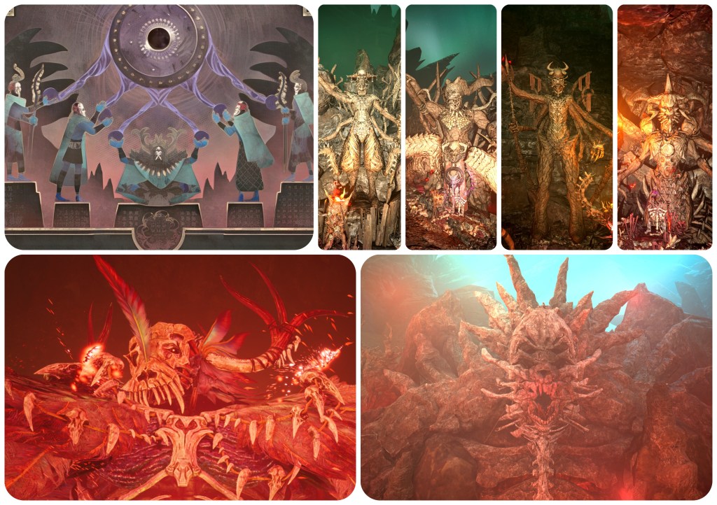 I’ll now be presenting some screenshots, collating all the things I’ve found which point to Jenova having once had presence in the Village of the Gi. After which I’ll engage in a series of my own questions and answers to try discerning why this imagery is present and what history we can glean from it. I’m not trying to, like, clickbait or anything, but the answers I reached kind of surprised even myself. Let’s just say that by the end I have come to suspect someone here is not who they claim to be. Through Xenogears we can use Final Fantasy X to explain Dirge of Cerberus within FFVII Rebirth. If you want to know what on earth that means, you’re gonna have to give me a few hours. There are just two or three seemingly random enemies who might tie everything together in the most unexpected way, and but a single one which I believe can crack the case wide open. The reading I get out is not that which I expected when heading in. I had the framework envisioned in my head, went in to find evidence, it didn’t fit, and so have come out believing in a more complex timeline of events. Then, once I was 26,000 words and 100+ collages in, I had an epiphany that saw me rerouting all my conclusions. We will get to that eventually though. For now, let’s look at some statues.