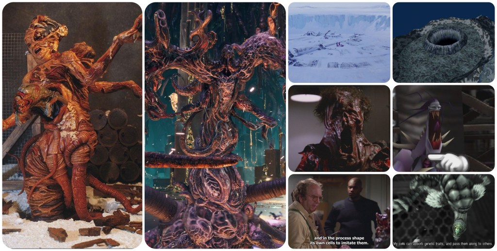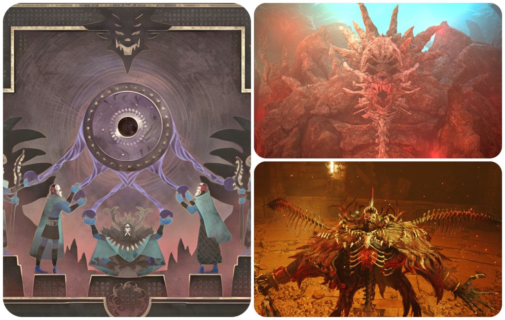 I love the Final Fantasy VII Remake series. One large reason for this being because the way its depiction of the characters and setting unfolds, where it chooses to add extra context or where in the presentation it decides to revitalise its intertextual symbolic links with stuff like The Thing, Xenogears, Chrono Trigger etcetera, all feels like it is done in accordance with my own preferences. At just about every step of the way, FFVII Remake is catering to me as an FFVII essayist fanboy. On my, like, sixth playthrough of FFVII, one story element that I did consciously think I would like to have more information about is the mysterious race of intelligent non-human beings sealed deep beneath Cosmo Canyon – the Gi Tribe. They kinda gloss over it, but that seems important actually. Sure enough, FFVII Rebirth made them a much, much bigger deal by giving them greater exposition, a deeper sense of culture, and using them as a means to expand FFVII’s galaxy by establishing them as aliens with their own red spirit energy that prevents them from being absorbed into Gaia’s green Lifestream. I don’t think that they’re going to end up especially important to FFVII Remake’s future trajectory, they aren’t some missing link for part 3 or anything; the alien Gi largely exist as background lore to better substantiate the Black Materia, since it was always a bit odd in the original that the planet-loving Ancients would possess magic to blow it up. But the more you ponder upon their riddles, upon the symbols found in their culture, the more fascinating and complicated their circumstances become. What first stuck out to me when Gi Nattak stepped into frame was the striking colour combination of his dark blue skin and burning pink eyes. This immediately grabs my attention because where have we seen this colour scheme before? Jenova. When you see a man like that glaring daggers at Aerith, you’d naturally think it’s related to Jenova’s war. We then let the shaman guide us into the land of the dead, where he begs the party to retrieve their Black Materia and cast the world-ending magic Meteor. Who arrived on a meteorite? Jenova. If you look around closely you can even locate these sharp-toothed skull masks mounted onto ceremonial artifacts which resemble both Jenova and its derivative Specimen H0512, or stone carvings of somewhat Jenova-like skeletal knights. The smaller statues which Nanaki uses to open the seal on the Gi’s cave do all give me Jenova vibes as well, with the random appendages or tentacles mutated onto a bipedal form. It does seem like the links between Jenova and the Gi are therefore multiple, and super apparent.