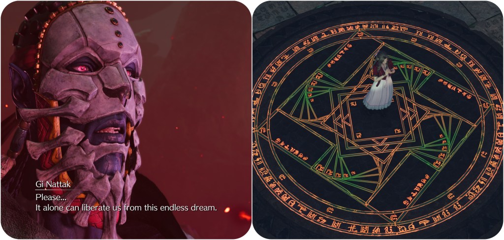 Chrono Trigger’s Lavos, Xenogears’ Animus and Anima, Dragon Quest IV’s Incarnation of Evil, huh. I do love me my intertextual discourse. Homage, references, analogues, and some things that might secretly be in the same canon. The only one explicitly stated to be linked though is Final Fantasy X, and this may in fact be the last piece needed for connecting Jenova and Chaos. Just like it’s no accident that the Temple of the Ancients has those three particular Jenova-stricken enemies together, it might be deliberate that Gi Nattak and the temple both call back to FFX at the exact moment necessary. One of the more major mysteris I still had lingering is that the Temple of the Ancients does have red Lifestream present at certain fountains, yet I believe that this colour should be locked to Terra. Earlier, however, I did remark that the Gi Tribe functionally are Unsent. Which is why it might be significant that Aerith tries to soothe the red energy in the Labyrinth of the Lifestream by genuinely performing a Sending dance. It doesn’t work out due to her lack of skill, be that is seemingly the methodology imparted to her by the spirits of the Cetra. So I think that might be the key.