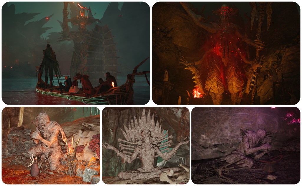 As Gi Nattak ferries us into his land, we pass by several large statues. These are all disfigured and mutated. Some with horns, some with tentacles. It is of note to me that a couple have the same kind of halo at their back that Safer Sephiroth displays, and one has what could be interpreted as a single wing on his left shoulder.