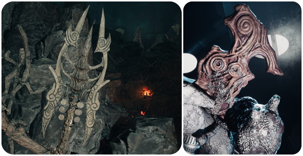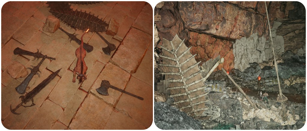 The set of weapons surrounding the first effigy that Nanaki encounters are all about the same size as his body, but further into the cavern there are shields, axes and polearms that make the characters look miniscule.