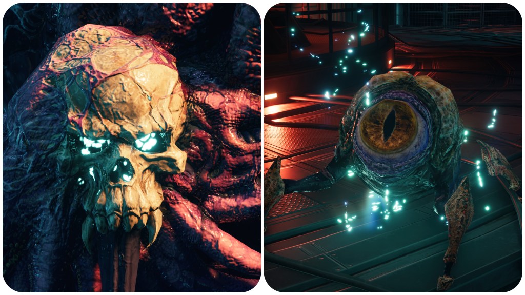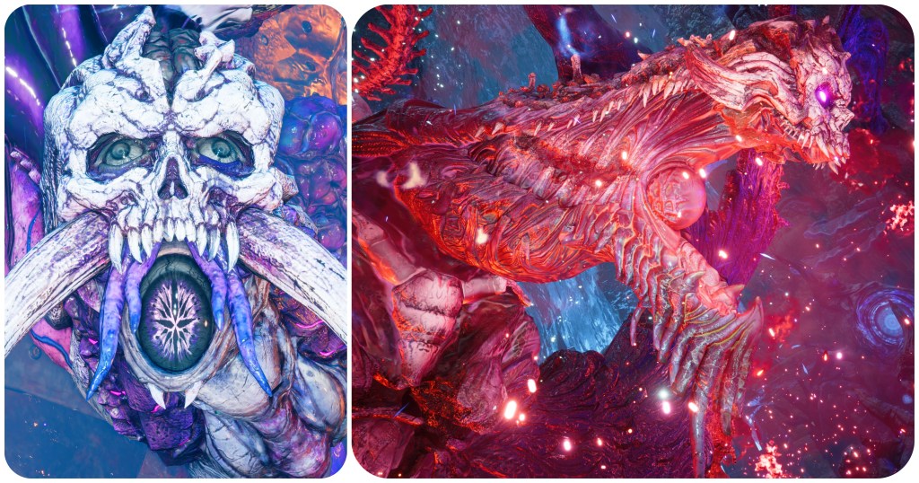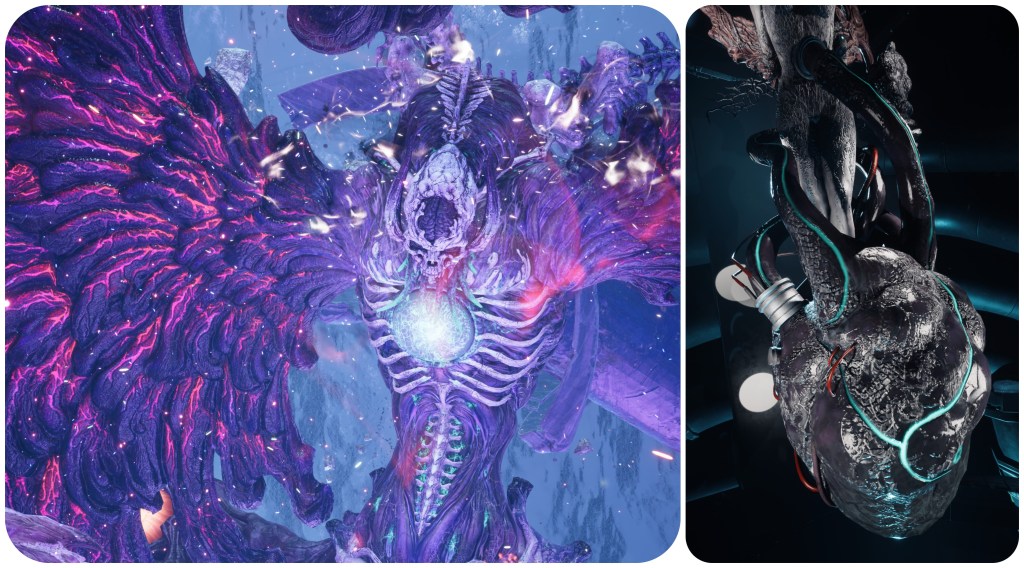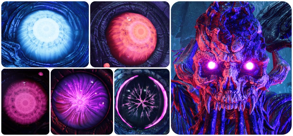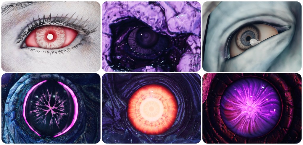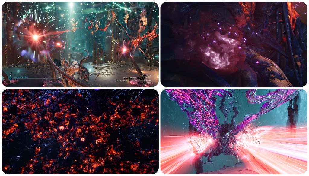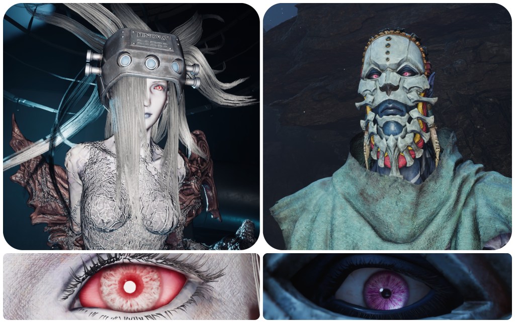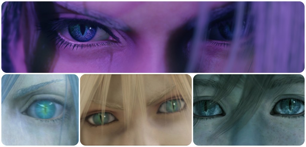 The woman at the Nibelhheim reactor is not blue and pink. That’s not to say no Jenova in Rebirth has had pink irises, however. Jenova Lifeclinger’s battle takes place in this cosmic horror arena. A chamber of guts and vertebrae and too many eyes. Most of those eyes are red, some of them are blue, and the remaining few are indeed pink. Also of note is that the bodily eye growths seen on Jenova Emergent and Jenova Lifeclinger are both pink, though with totally different irises to each other, and in the final phase Jenova Lifeclinger’s main eyes glow pink.