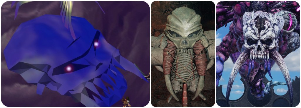For what it’s worth however, the mouths on Jenova Emergent and Jenova Lifeclinger almost give the impression of some other monster merely wearing that human skull like a mask at the very front of its giant head. Lifeclinger’s long mouth running down its neck honestly gives me a similar vibe to The Imprisoned from The Legend of Zelda: Skyward Sword.