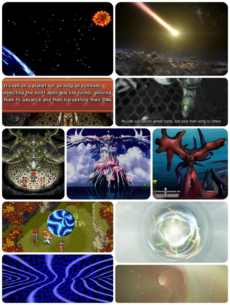 Conceptually I would think Chrono Trigger and its iconography to be the origin of all the other offshoots though, and the ending of Xenogears demands it being put at the end point of any given timeline. So Lavos, then the Time Devourer, then Jenova, then Deus.