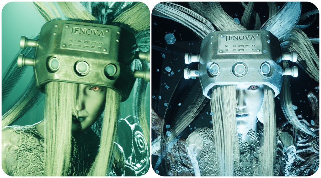I mean, that certainly is possible. I do tend to be conscious of the fact that sometimes colour is representative, right? Artistically applied in a way where surrounding colours cause one colour to become contextually perceived as another. Like how Chris from Symphogear has white hair, yet if you go into Photoshop and and eyedropper that you’d actually get purple. But her hair is definitely intended to be recognised as white and they somehow use the adjacent colours to lead you into perceiving it as such. Similarly, I did think of the possibility that Jenova may have been coloured through that kind of principle.