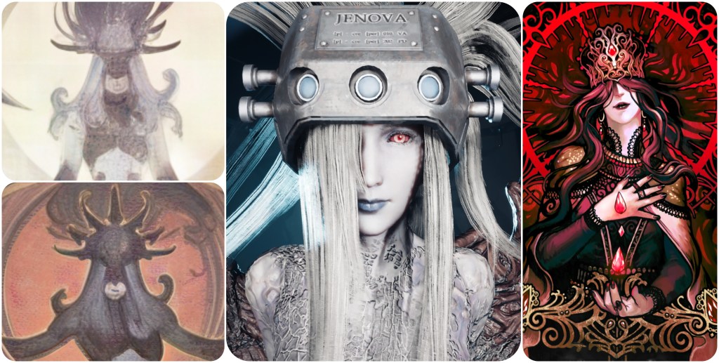 It’s possible that Jenova landed on Gaia as a woman, as per the depictions in the Hall of Murals. The woman in the mural, or what traits we can glean of her, does look relatively similar to the Jenova at Mt Nibel. Greyish-blue skin, flowing silvery hair. Notably, the grey skin Jenova is drawn with here is unique and deliberate, because the Cetra surrounding her have beige skin. However neither design or colour scheme matches to the Shadowblood Queen, who should be considered one of Jenova’s earliest and most impactful disguises since a legend states that her blood birthed all the fiends of the world. So the mural designs resembling that Mt Nibel lady may simply be coincidental.