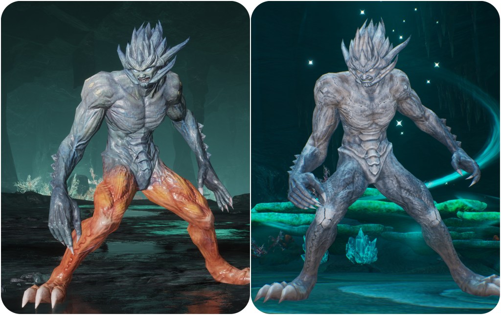 If we’re looking at any kind of advanced Jenova-human hybrid to see what colour their skin is, then we should probably be looking at the Makonoids which were growing inside of the Mt Nibel mako chambers. While these have not traditionally been known to possess Jenova cells, the Rebirth Material Ultimania describes them as being akin to “a juvenile form of Heretic Rayleigh”, which is what the Diabolic Creation and Variant are named in the japanese script, indicating that they have some hefty dose of the mutagen. In Final Fantasy VII and Crisis Core the Makonoids are the same light blue that Jenova is, while in Rebirth they have grey skin that matches the new Jenova design.