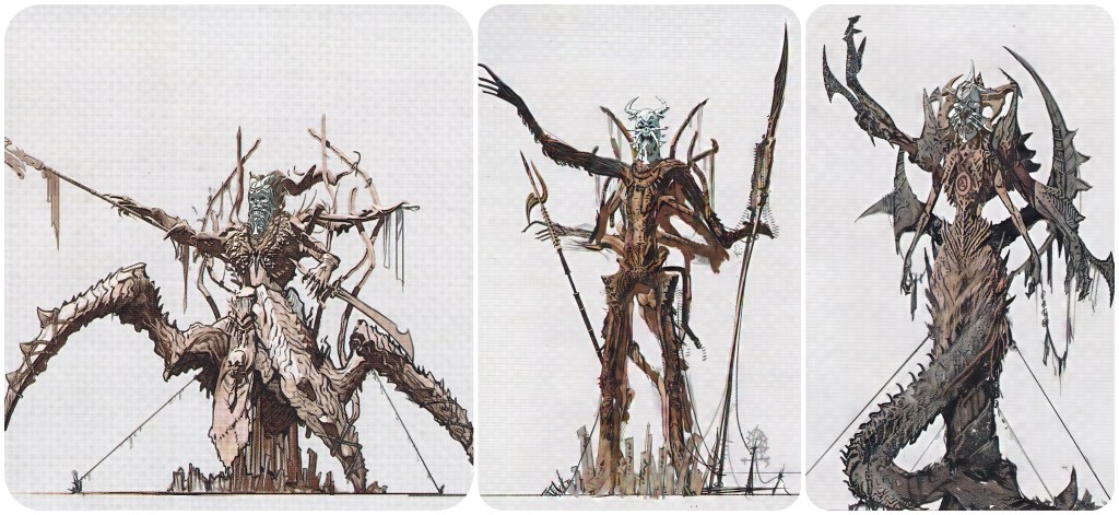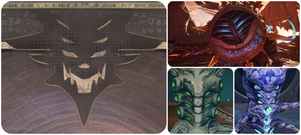 If we were to restore back the original, main implication in the pre-Terra Compilation canon where Chaos is a consciousness born out of the Cetra’s stagnating Lifestream, and therefore a lifeform native to Gaia which is genuinely meant to be symbiotic with the Omega Weapon, the new interpretation would be that Jenova landed with this alien skull we’ve seen on the Blighted Spirit (Ever Crisis). She infiltrated Cetran culture and saw their legends of this tusked demon, located the Village of the Gi and saw them worshipping the same symbol, then took her current face from that. To empower the Gi as they marched against the Cetra, having also given them her terrible mutagenic enhancements, and to strike fear into the Cetra who had seen their folklore made flesh.