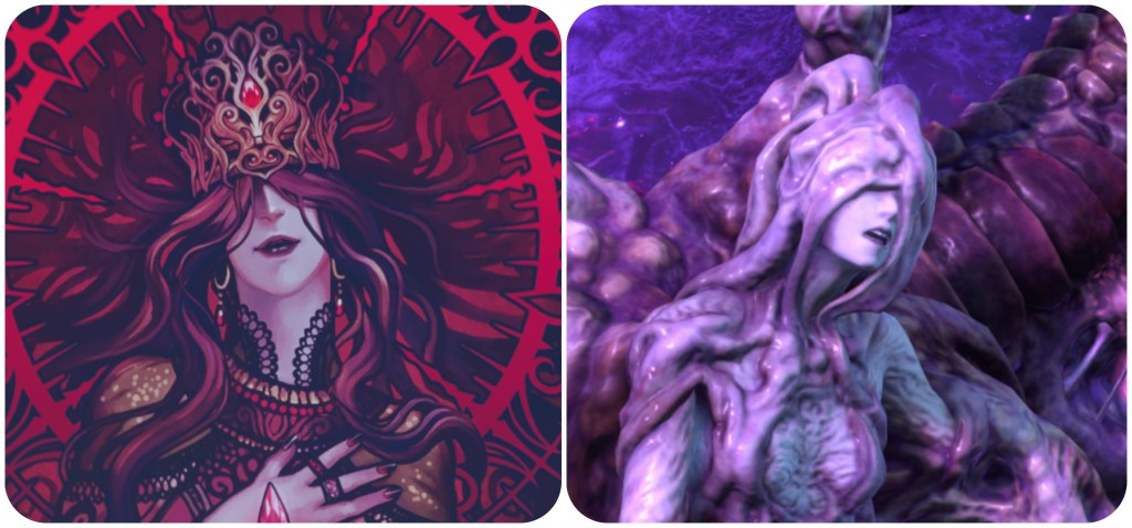 The Shadowblood Queen and Revenant Mother are both depicted with hair or flesh that covers the eyes like a veil.